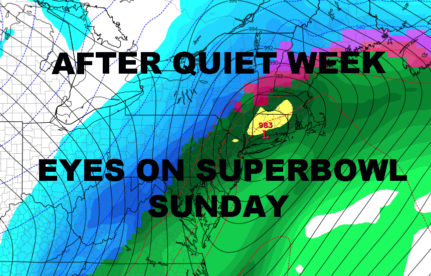 AFTER QUIET NYC WEEK EYES SHIFT – Good morning everyone! This morning, I’ll be discussing a possible system that I’ve been watching for a few days. Model after model shows a large, moisture-laden system coming out of the midwest with some Gulf influence and into our area possibly Super Bowl Sunday/Monday. After a quiet and seasonably cold week, a reinforcing shot of similarly cold air will most likely move in late next week, just in time for this system.