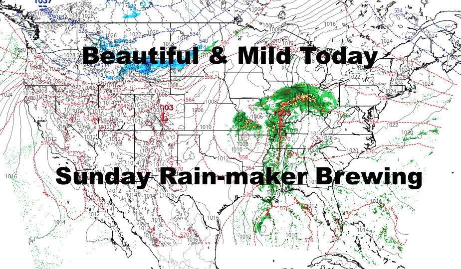 Good morning everyone. I’m back and so is the mild weather temporarily. We find ourselves today in the quiet zone, with one system well gone and out of the picture, and another that’ll begin to gather for Sunday’s forecast. Things were questionable for our weekend and the 2 systems involved didn’t materialize in a way that would ruin both Saturday & Sunday, but there will be enough with our southern branch to pretty much ruin Sunday.