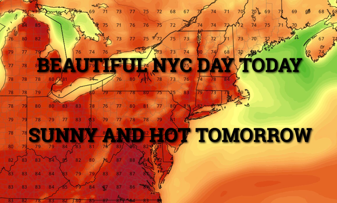 BEAUTIFUL NYC DAY HOT SUNNY SUNDAY AHEAD – Good morning everyone! Beautiful weather is upon us and we’ll have a near-perfect day today. Sun and clouds, a light breeze, and highs in the mid 80’s in most areas, near 80 at the immediate shore.