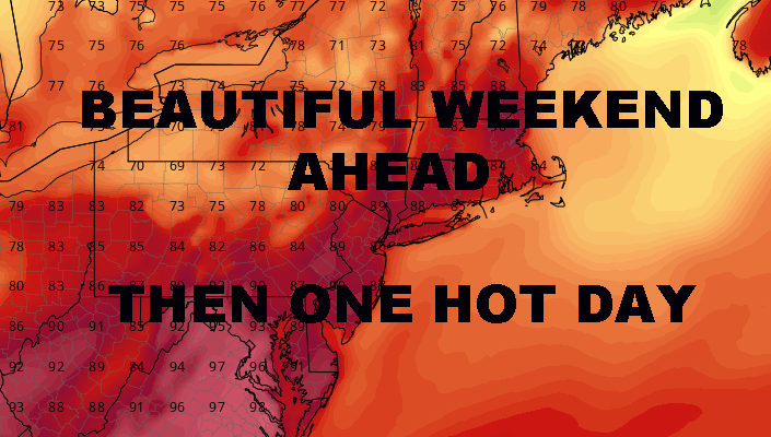 BEAUTIFUL WEEKEND PRECEDES ONE NYC HOT DAY – Good afternoon everyone! We have a beautiful weekend unfolding as we await the final passage of some upper level energy. Even so, sunny skies and warm temps will prevail today, before and after the transit of some scattered storms.
