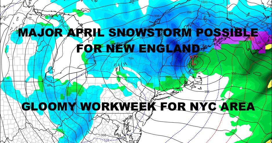 Our timeline remains late tomorrow through Thursday from west to east on all of this, and we’ll watch closely for redevelopment of low pressure near or off of the New England coast some time on Wednesday. If this does unfold and low pressure is strong enough to pull down cold enough air, we could be looking at historic snowfalls for parts of interior New England; where 18-24″+ of snowfall will be possible. Does it happen this big in April? Sure, but it’s very rare and would be one for the record books. The last time we saw anything this big possible for early April in New England, was back in 1997.