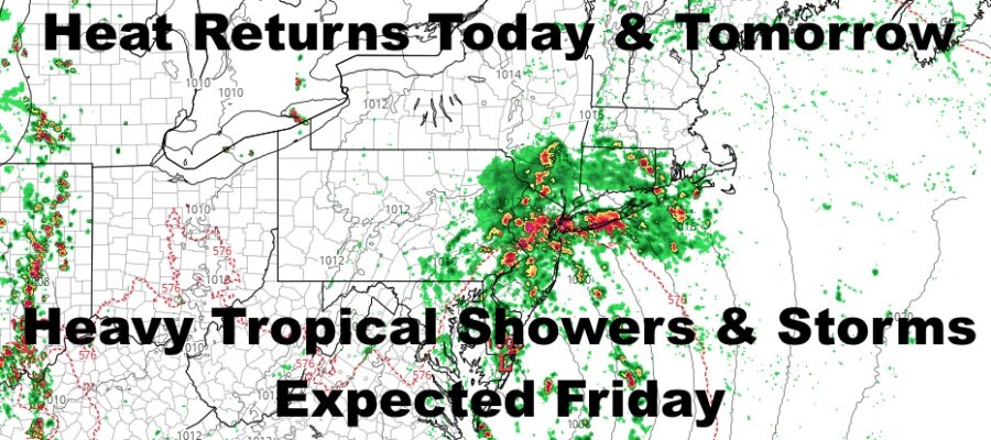 Good morning everyone. We continue to have a lot of subjects to cover forecast-wise, with a multitude of stories, including the start of a possible heatwave late next week. Today and tomorrow will be no slouch in the heat department, but then low pressure rising up the coast will suppress temps slightly with clouds and heavy showers & storms.