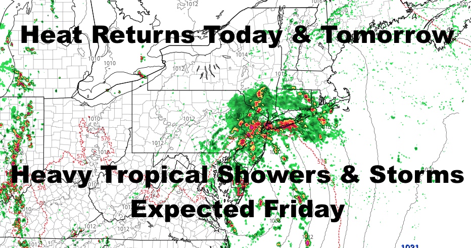 Good morning everyone. We continue to have a lot of subjects to cover forecast-wise, with a multitude of stories, including the start of a possible heatwave late next week. Today and tomorrow will be no slouch in the heat department, but then low pressure rising up the coast will suppress temps slightly with clouds and heavy showers & storms.