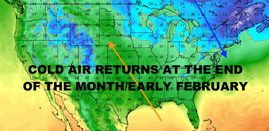 After that, colder air begins to seep down from the north. This will be a different type of cold airmass and won’t be as cold. It also won’t be far-reaching in terms of real estate. This looks to be the Northeast and New England’s problem, before an un-friendly snow-pattern pushes the cold air out before the first week of February ends.