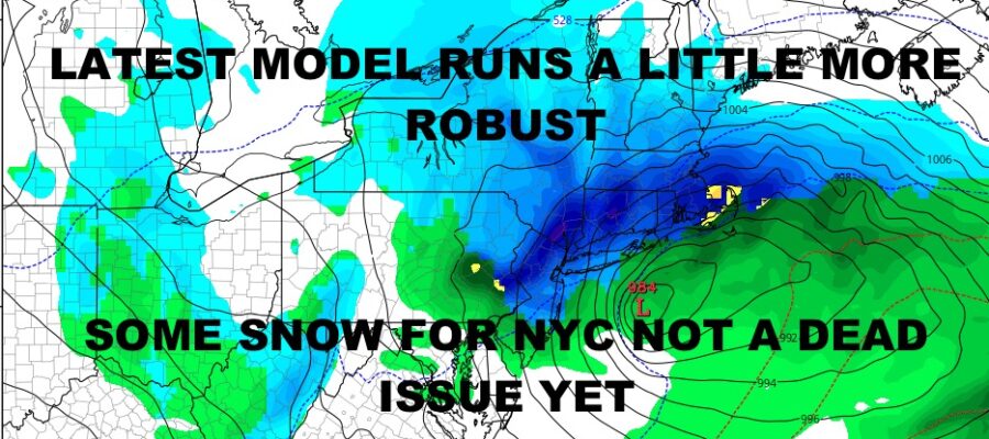 Our latest model run on the GFS shows a more robust system that could help those snow lovers in the New York City area by keeping a glimmer hope for some accumulating snow. A stronger system and a difference of 40-60 miles, could mean the difference between rain and mixed precip, to rain changing over to heavier snow before departing. As of this moment, we will keep the biggest accumulations expected, to the confines of eastern and northeastern PA, Northwest NJ, the lower Hudson Valley of NY, and parts of lower New England. This is where we will most likely see that 4-8 or 6-12″ swath of snow, with even bigger amounts if some stronger convection sets up.