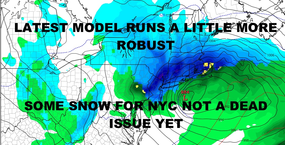 Our latest model run on the GFS shows a more robust system that could help those snow lovers in the New York City area by keeping a glimmer hope for some accumulating snow. A stronger system and a difference of 40-60 miles, could mean the difference between rain and mixed precip, to rain changing over to heavier snow before departing. As of this moment, we will keep the biggest accumulations expected, to the confines of eastern and northeastern PA, Northwest NJ, the lower Hudson Valley of NY, and parts of lower New England. This is where we will most likely see that 4-8 or 6-12″ swath of snow, with even bigger amounts if some stronger convection sets up.