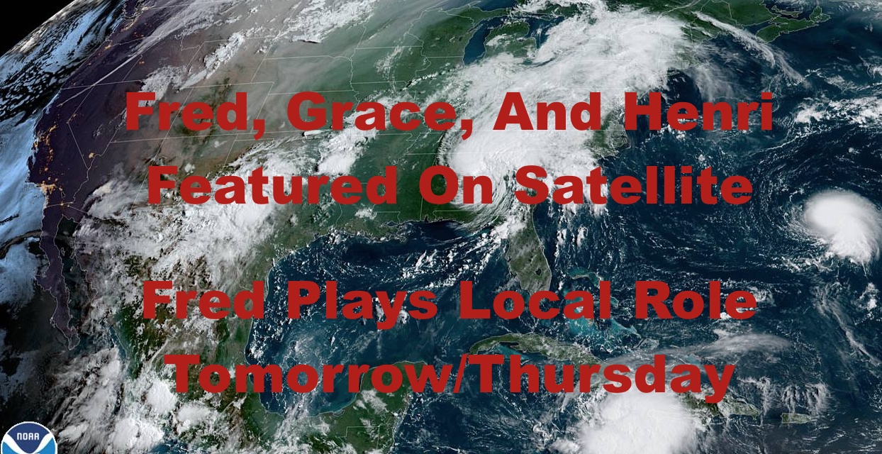 Good morning everyone. Fred is down south and he’s going to come into the area between tomorrow and Thursday, not only getting the area wet, but moist too with tropical-like humidity. Other than that, the tropics remain bust with Grace and Henri, and temps remain sub 90 for a decent stretch.