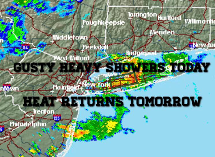 HEAVY GUSTY SHOWERS TODAY HEAT RETURNS TOMORROW – Good morning everyone! People of the NYC metro area are getting free car washes and hands-feee watered lawns and plants thanks to a batch of heavy showers moving through the area. We should have a decent break in between before we watch and see if another wave forms to bring us another round of gusty showers and storms later today. Highs today will be a very humid upper 70’s to low 80’s, with sun and clouds in between the two batches.