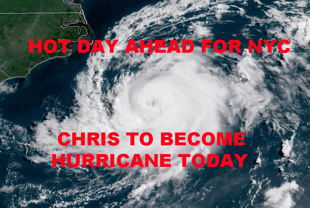 HOT NYC DAY TODAY CHRIS BECOMES HURRICANE – Good late morning everyone. We have a hot one today in New York City, but it’s nothing we can’t bare compared to the big heatwave we had last week. Also in the news, Tropical Storm Chris should be a hurricane by next advisory, or the one thereafter, if it’s not a Hurricane already.