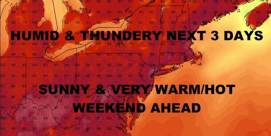 We still have the chance of some PM showers & storms for interior parts of the Northeast, but they won’t be as numerous. However, numerous showers and storms return tomorrow and Thursday, and we could see an embedded severe weather component especially on Thursday. Hot conditions resume this weekend as the region dries out rain-wise.