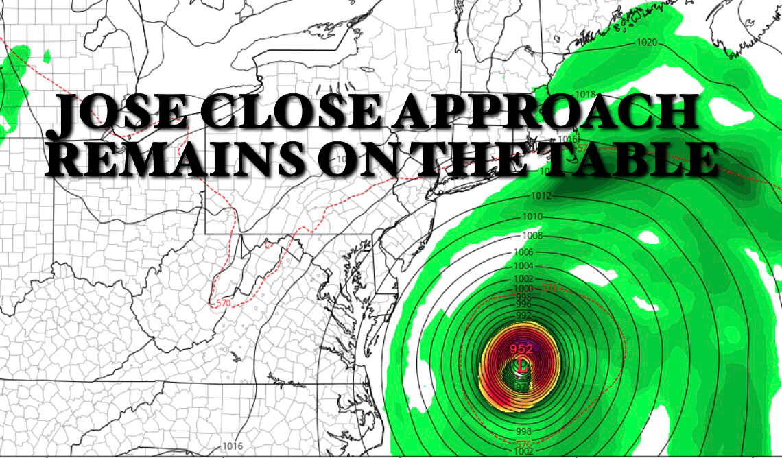 Hurricane Jose continues to be a thorn in our side meteorologically, but is not an Irma or a Harvey. Steering mechanisms in place continue to keep Jose rather weak as he executes his loop maneuver. As of this very moment, Jose continues to look like he will make a close pass to the east coast before moving back out to sea. This scenario would mean nothing to anyone except shipping lanes, surfers, and photographers if it played out in this exact fashion.