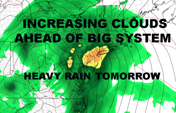 INCREASING CLOUDS TODAY HEAVY NYC RAIN TOMORROW – Good morning everyone! The sun is out, but signs of an approaching system have begun. Westerly winds have swung around to a cool breeze out of the east ahead of a very large system heading our way. Throughout the day, clouds will slowly increase and temps will reach 60-65 in most places. Overnight, clouds will lower and thicken and we should see our first raindrops right before daybreak tomorrow.