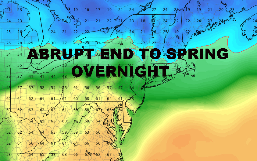 LATE NYC NOVEMBER REPLACES LATE MAY OVERNIGHT – Good morning everyone! We have another beautiful day ahead with warm temps and sunny skies, but it’s all coming to an end quickly as a backdoor cold front strikes one blow, then a sweeping cold from the west finishes the job.