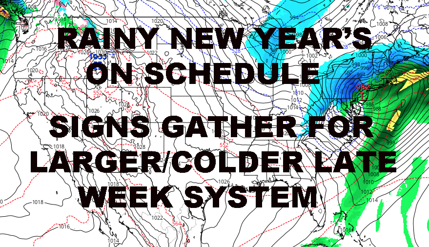Good morning everyone. Our rainy New Year’s Eve in the New York City area is looking on schedule and will definitely dampen the festivities for those looking to be outside. Plus, signs are gathering we could see something more significant coming our way for late week as two areas of energy may merge.