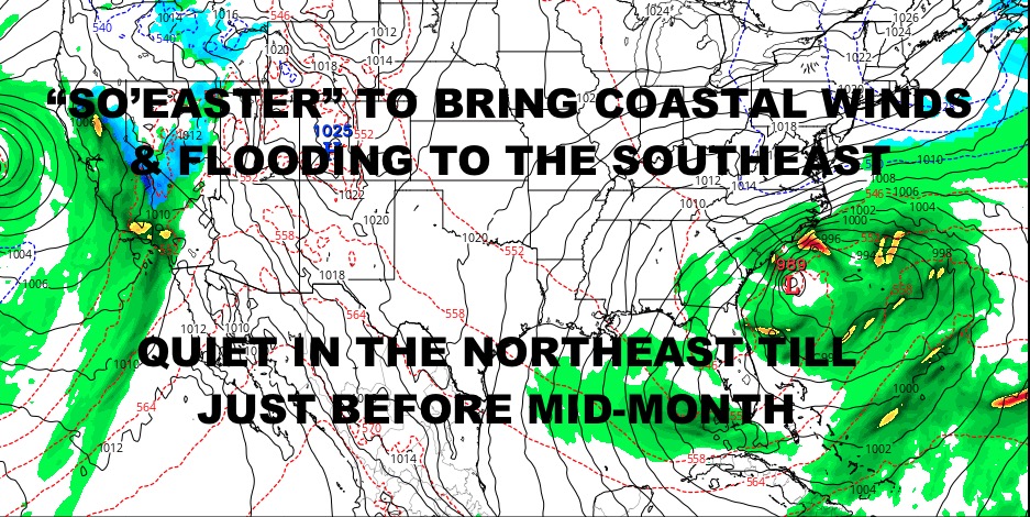 All remains quiet in the long range aside from some fringe-effects of Tuesday’s “So’Easter” in the form of steady winds, enhanced tides, and enhanced surf. So far we don’t see anything of consequence on the horizon until some time just before mid-month, where we could see yet another vigorous system take shape in the lower Midwest and race into the Great Lakes.