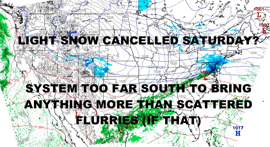 We have the chance of some scattered light snow or flurries late overnight Friday into early Saturday morning. Again, most of that snow will be well-south of the area. If our system does get squirelly and that shield of steadier precip makes it here, look for a trace to 1″ of snow at best. Highs Saturday in the mid to upper 30’s under clearing skies.