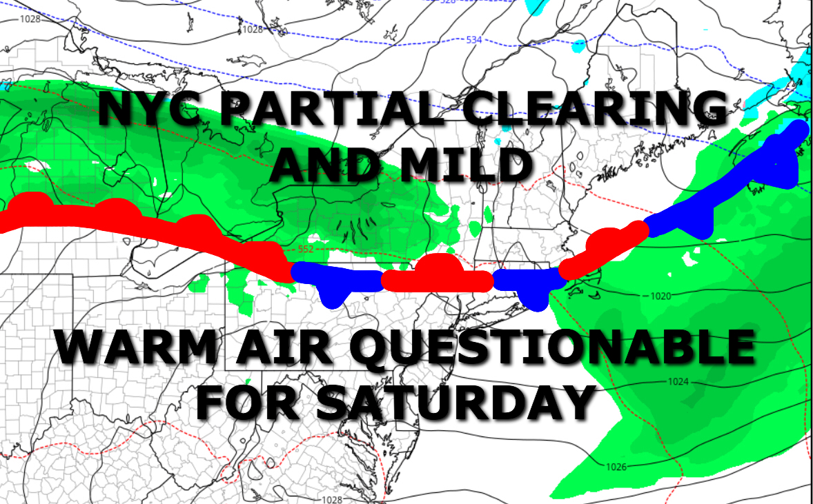 MILD NYC TUESDAY WARM AIR QUESTIONS SATURDAY – Good morning everyone! We’re waking up to a cloudy Tuesday with some scattered sprinkles, but things will begin to clear out later today. Clouds and sun will be with us in the afternoon, with highs in the mid to upper 50’s. We’ll drop into the low 30’s tonight with light NW winds, then a reinforcing shot of cold air rushes in tomorrow. Winds will increase and temps will only reach the mid 30’s before dropping through the 20’s late evening. Thursday will be sunny and winds will calm down by mid-morning, but the cold air will hang on; highs in the mid to upper 30’s.