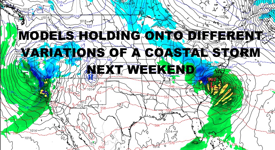 Good morning everyone. We continue to watch our weather models very closely in regards to several ingredients that may come together for someone on the East Coast next weekend. I say “someone” because while the models hold onto the idea of a Gulf or near-gulf sourced system, there have been big variations as far as who sees what (if anything at all).