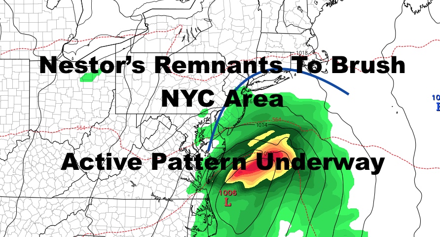 Good morning everyone. Lots going on in the weather in terms of activity and changes going on, so bear with me as we have a big segment here. Tropical Storm Nestor is up in the batters box first after a nice day today. We won’t be getting any of the effects the Gulf Coast and interior Southeast is seeing, but it’ll somewhat ruin what was supposed to be a nice Sunday before he existed.