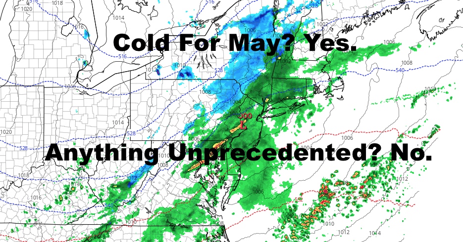 So what’s happening? Yes, unseasonably chilly air is heading in as a new system arrives and developing low pressure scoots away. There will be cold enough air aloft to create some possible parting wet flakes or wet flakes mixed with snow briefly as everything ends, buts that’s the extent of our armageddon.