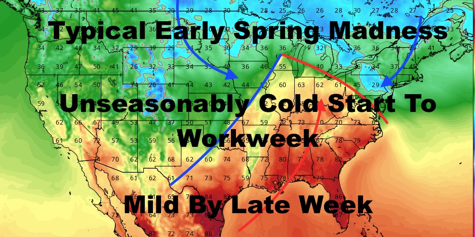 Good morning everyone. We’re not done yet with the potential for an afternoon rain squall and/or snow squall today as another spoke of energy comes down from the Great Lakes to reinforce very cold air coming in. After that, we have an unseasonably cold start to the week, then we go mild for Thursday/Friday. Thus is the start to spring, where wild ups and downs in NYC Metro are commonplace.