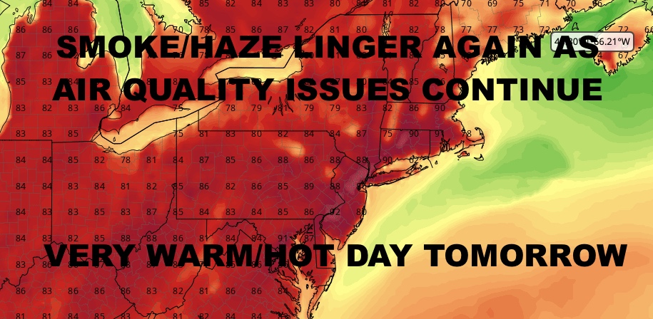 Look for more air quality issues today and tomorrow, with highs today pretty much where they’re at. 80-85 will be it, with cooler conditions along the immediate shore.