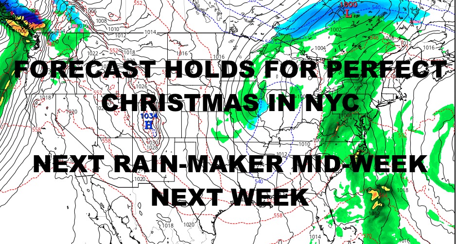Good morning everyone. We don’t have much to talk about aside from some really beautiful weather expected up and down the East Coast for Christmas Eve Day and Christmas Day itself. It’s going to be a quiet and chilly to cold one until Sunday, where we see a nice little boost in the temperatures. Other than that, our next rainmaker will probably head in some time late Tuesday, and as of now things don’t look as dynamic or as the powerful storm we just had.