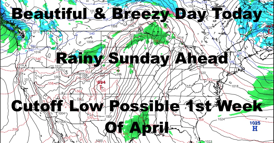 For today, we have bright sunshine and a fairly mild day as cool air lags behind tomorrow’s system. It’ll also be on the breezy side (but not windy like yesterday eve), with NW winds in the 10-20mph realm. Look for highs in the mid to upper 60’s almost everywhere.