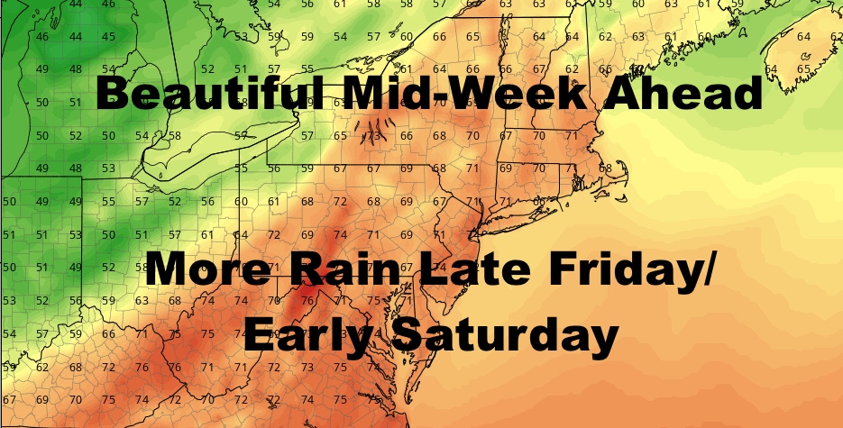 Good morning everyone. As promised, we have a gloomy, drizzly, raw start to our day today. Things may clear up late, and it’ll definitely be nice and clear by tomorrow to start a beautiful 2 day stretch for our mid-week. Another system swings through Friday into early Saturday, and that one may be on the vigorous side. The good thing though is that it’s on the move and most of our weekend is looking ok.