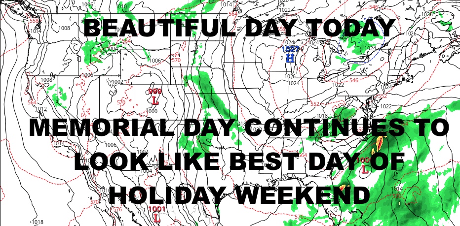 Things remain looking complicated for Memorial Day weekend as we watch moisture off of the SE/Mid Atlantic coast. As of this moment, we’ll increase the clouds on Friday and that easterly fetch will keep us on the cool side. We look dry for the moment, but could see some late scattered showers Friday into Saturday. We could see some partial clearing Sunday with a few scattered showers, then decreasing clouds Monday and milder/warmer conditions.