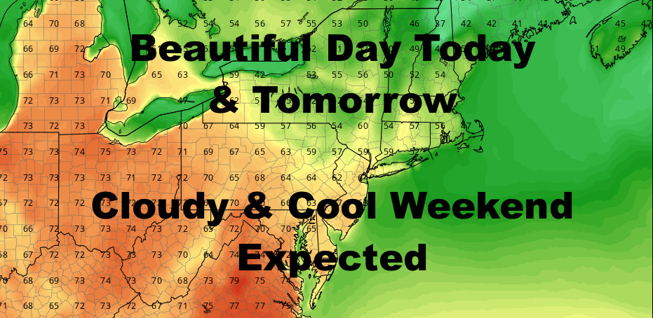 Our weekend remains somewhat gloomy, with more clouds than sunshine Saturday and mid to upper 50’s; then even more clouds on Sunday with the chance of some rain. Highs Sunday will be a raw mid 50’s.