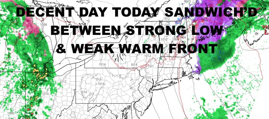 Clouds increase tomorrow ahead of a week warm front, but precip arrives too late and too unorganized for any early mixing or snow. Look for highs in the mid to upper 40’s with the slight chance of a few PM scattered showers.