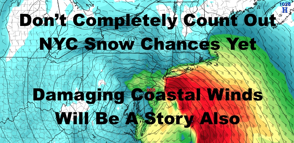 Either way, this will be an impressive system, dropping big snows for those who see all or mostly snow. Plus, winds will be a big issue along the immediate coast, with 40-50mph sustained winds possibles and gusts in the 60-70 range; especially at the Forks, Block Island, Nantucket, and Martha’s Vineyard.