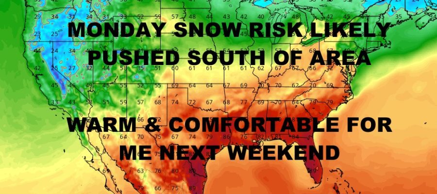 Good morning everyone. Today’s a good news-bad news kinda day, so we’ll jump right into it and give you the good news. For Monday’s overrunning scenario, high pressure will build in too strong to allow for any significant snow; so NYC and Long Island can breathe a sigh of relief. The bad news is that it’ll be a cold one for a couple of days with some teens overnight.