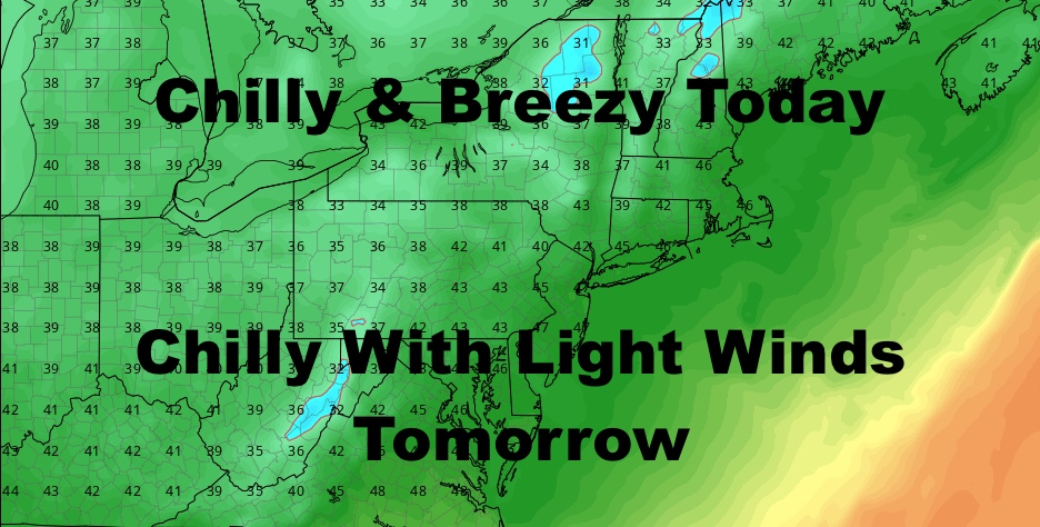 Sunshine, a stiff breeze, and highs in the mdi to upper 40’s will be the best we do today. We’ll remain chilly tomorrow with mid to upper 40 again, but winds will go very light and switch to a more southerly flow. That southerly flow is with the approach of our next cold front.