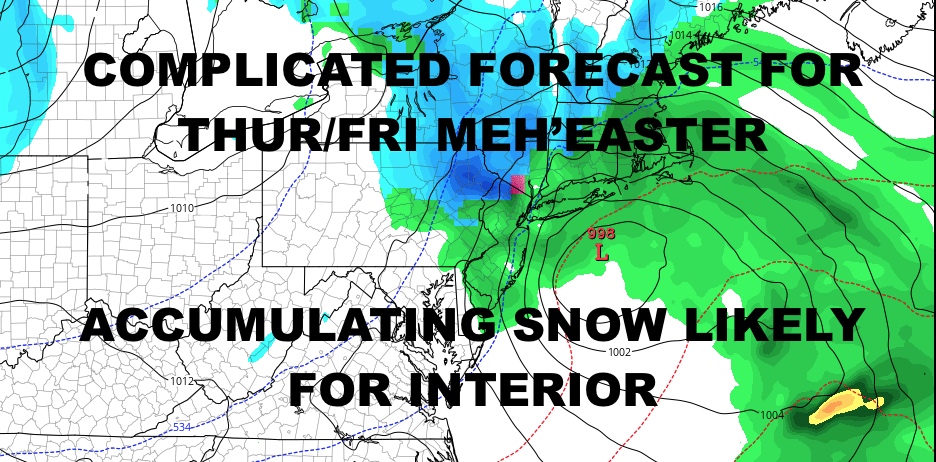 We still have a ways to go on this, but right now we’ll have increasing clouds Wednesday night, with a continuing lowering and thickening of clouds Thursday morning. We’ll have the chance of cold rain by mid to late afternoon, and interior parts of the Northeast should see a mix or snow developing. We won’t get into rain/snow lines yet as it’s too early, but a cold rain is almost a certainty here with highs in the low 40’s.