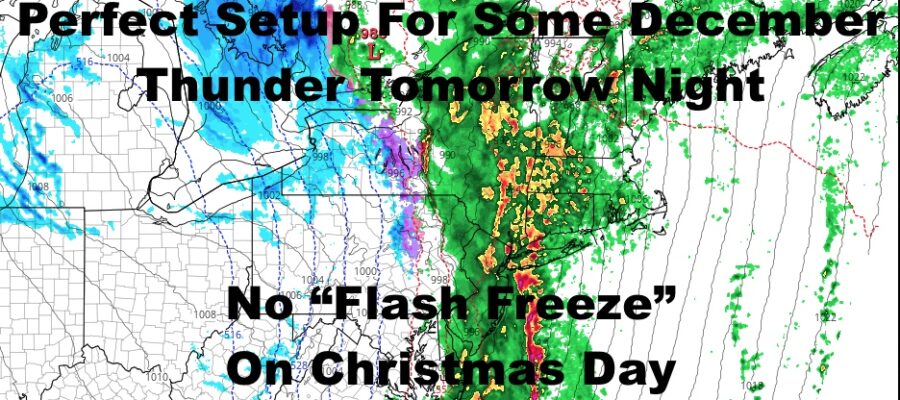 Good morning everyone. The “nicest” day of the week is upon us, and it’ll be a quiet and seasonable one before things get squirrelly tomorrow. One thing I’ve noticed on social media, is this talk of a “flash freeze” for Christmas Day. While it will be much colder, the cold air isn’t moving fast enough behind the rain to make this happen.