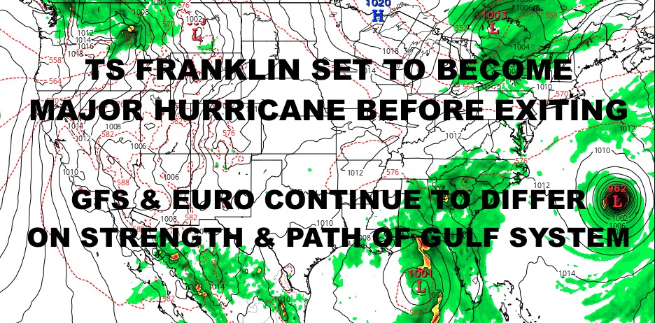 As far as the tropics are concerned, Tropical Storm Franklin is nearing hurricane strength as winds have increased to 65-70mph sustained. I believe by the next bulletin or two, we should have a hurricane on our hands. As it goes in between the Carolinas and Bermuda before scooting out to sea, I do believe we will see it become a very formidable hurricane. At minimum, it will be the strongest tropical system of the Atlantic season so far.