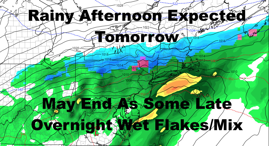 Good morning everyone. We’re in one of those transitional phases as our pattern shifts slightly in a better direction, but we have to see this through before we can get to the other side on Sunday. With that transition, we’ll be stuck in the clouds today through Friday AM, and tomorrow afternoon looks like a rainy one. We’re also keeping an eye on the timing of cold air vs. the moisture leaving, to see who wins out. If the cold air wins, we could see a mix of some rain and wet flakes, or a brief majority of wet flakes as everything moves out late overnight Thursday into very early Friday AM.