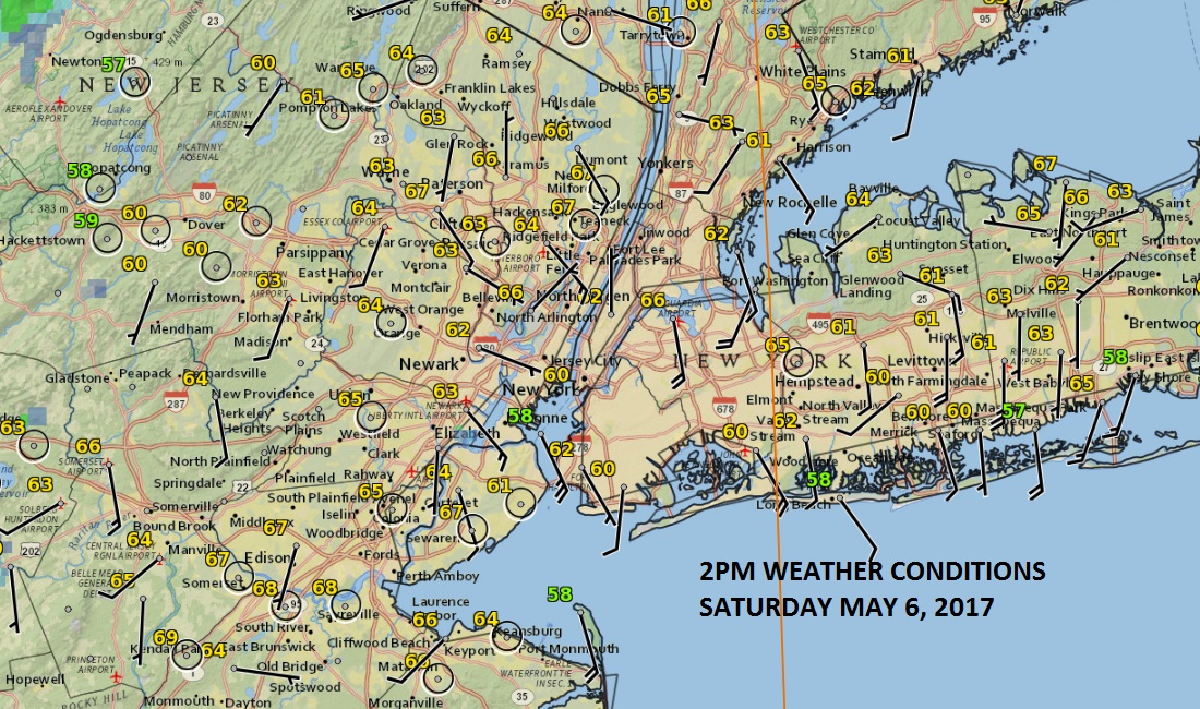 NYC CLOUDS SHOWERS RETURN FOLLOWING SUNNY REPRIEVE – Good afternoon everyone! If you’re out there enjoying the sun, things are about to change as the upper level low pressure system stuck in Pennsylvania sends a spoke of clouds and scattered showers our way. Over the next few hours, clouds will spin into our area and while most of the energy will go to our north as far as rain, we still have a chance at some showery conditions and maybe even a rumble of thunder if we get some help with the energy from the spring sun. Highs have reached their peak today of 60-65 in most areas and we will begin to cool off with the help of some gusty winds and those eventual clouds.