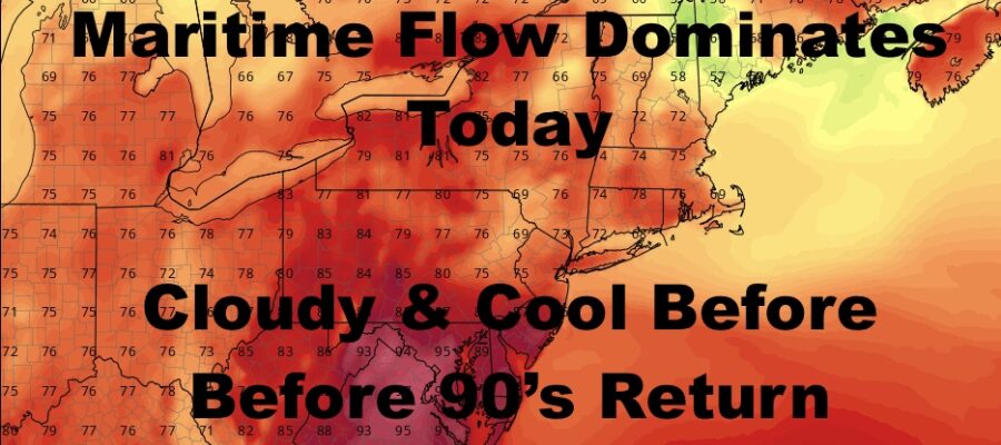 Look for cloudy/mostly cloudy skies today, an easterly flow, and highs in the upper 70’s. Some spots may hit 80 if we get some blue patches. It’ll also be on the humid side even though it’s below average temp-wise.
