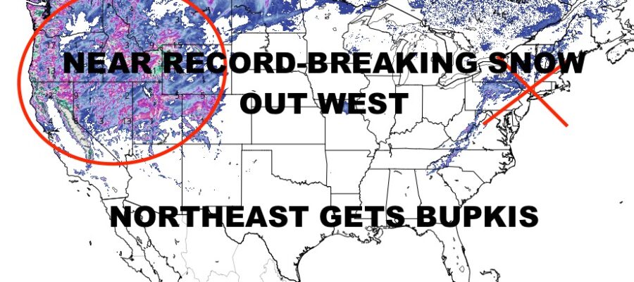 Clouds stick around after rain moves through in the Northeast, but we go fairly mild for a few days ahead of the next system midweek next week. That system is our big story of the day, not for the Northeast, but for the West. Near-record-breaking snows are expected as Blizzard Warnings have been posted along the Sierra-Nevada range, and Winter Storm Warnings posted throughout the other ranges in the Northwest & Rockies. In some locales, more than 8ft of snow may fall in under 48-72hrs, while some mountain passes could see 100+ mph winds. This is a serious storm that will add onto an already-epic base of snow that’ll be sure to help refill some of the reservoirs come spring and summer.