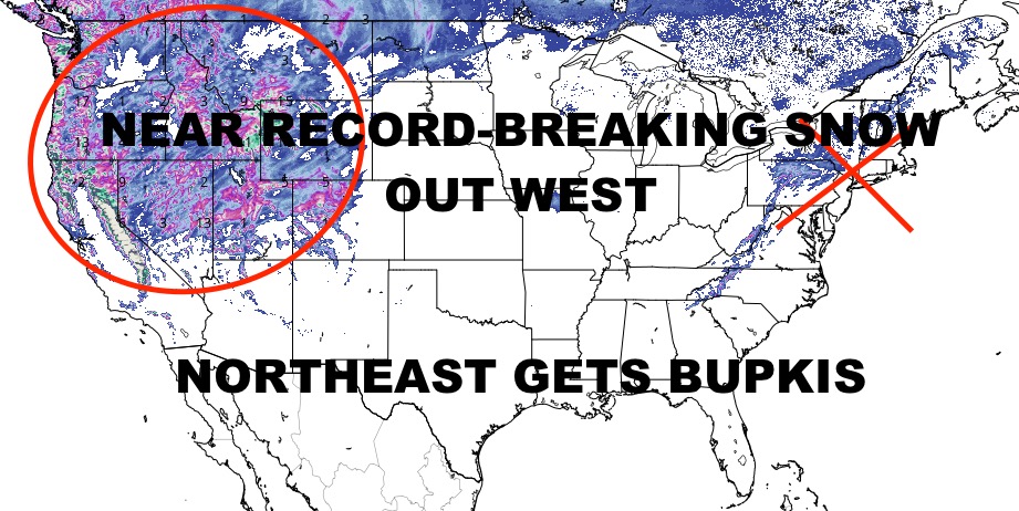 Clouds stick around after rain moves through in the Northeast, but we go fairly mild for a few days ahead of the next system midweek next week. That system is our big story of the day, not for the Northeast, but for the West. Near-record-breaking snows are expected as Blizzard Warnings have been posted along the Sierra-Nevada range, and Winter Storm Warnings posted throughout the other ranges in the Northwest & Rockies. In some locales, more than 8ft of snow may fall in under 48-72hrs, while some mountain passes could see 100+ mph winds. This is a serious storm that will add onto an already-epic base of snow that’ll be sure to help refill some of the reservoirs come spring and summer.