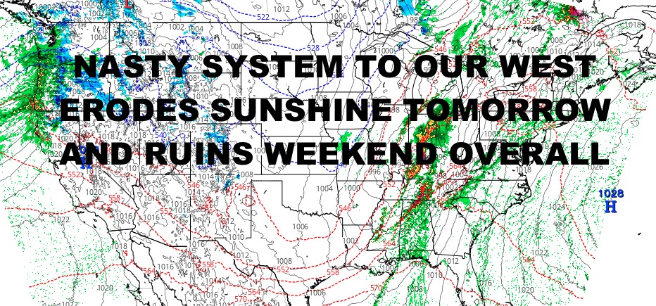 Good morning everyone. We continue to watch a developing system out west that’ll impact a large part of our Nation in terms of severe weather and tornadoes. The severe weather component won’t impact us in that way, but today will be the last day of full sunshine until Tuesday.