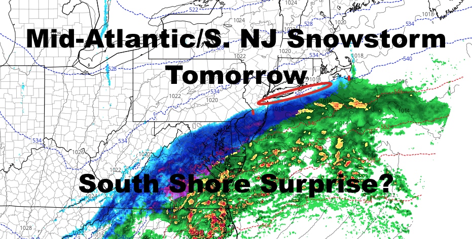 Good morning everyone and it’s good to be back! I’m being thrown right into the fire here with a very challenging forecast late overnight tonight and tomorrow for the South Shore and East End of Long Island. A coastal system is taking form and should hit parts of Virginia, Maryland, Delaware, and South NJ with some fairly hefty snow over a short amount of time. We’re watching this very closely, because a jog north of only 10-20 miles, could send some light to moderate snow into the South Shore and East End of Long Island.