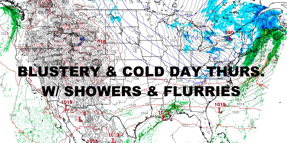 We’ll have showers and/or a mix of rain and snow overnight tomorrow, but don’t expect any accumulations with temperatures remaining steady. Scattered showers continue on Thursday, with increasing winds and temps dropping into the 30’s throughout the day. Any leftover moisture will turn into scattered rain & snow and/or all snow flurries and squalls. Wind gusts may exceed 40mph at times.