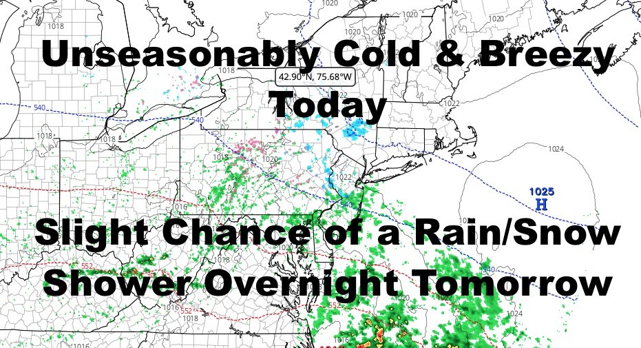Clouds move in tomorrow ahead of a weak system, and that’ll give us the slight chance of a rain or snow shower in the afternoon and/or overnight. Highs will be in the upper 30’s to low 40’s, and the best chance of seeing any flakes would be N&W of the NYC area. No accumulation is expected.