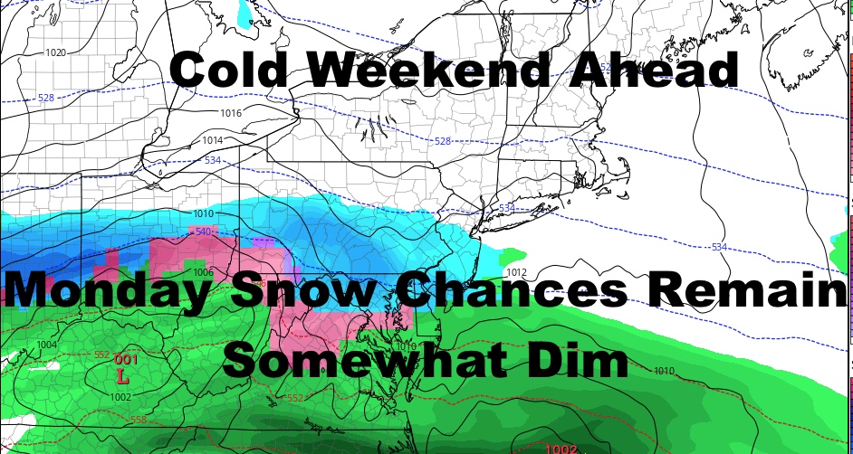 Regardless of what happens Monday/Tuesday, at minimum we bring clouds into the area, even if most of the energy slides to our south. As of now, we’re going to go with increasing clouds Monday, cold & raw, with highs in the mid 30’s. We’ll have a slight chance of snow Monday night, but confidence is very low. Unless anything big changes, anything that does fall will be very light, but I’m leaning towards no snow right now.