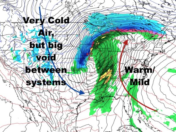 Back to mathematics and chance, if we have a setup like this in mid-February (with February being a short month), what do you think it does to our area? Let’s pretend for a minute that the graphic above is accurate, and we have this monster system in mid-February. Obviously, this would be a rain-maker for much of the Northeast, but it does something else. A mid-February setup like this, gives us a rainy day with very cold air behind it, but typically no systems are behind these for several days, sometimes even longer.