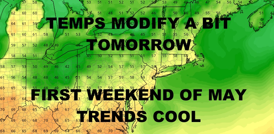 Good morning everyone. Cloudy, damp, and raw conditions continue today as a wave of low pressure slowly pulls away. Overall, we are locked in a very cool pattern aside from a day or two here and there. Tomorrow will be one of those days with a little bit of a break, but nothing outrageous is expected as far as mildness or warmth. Check out the latest below…